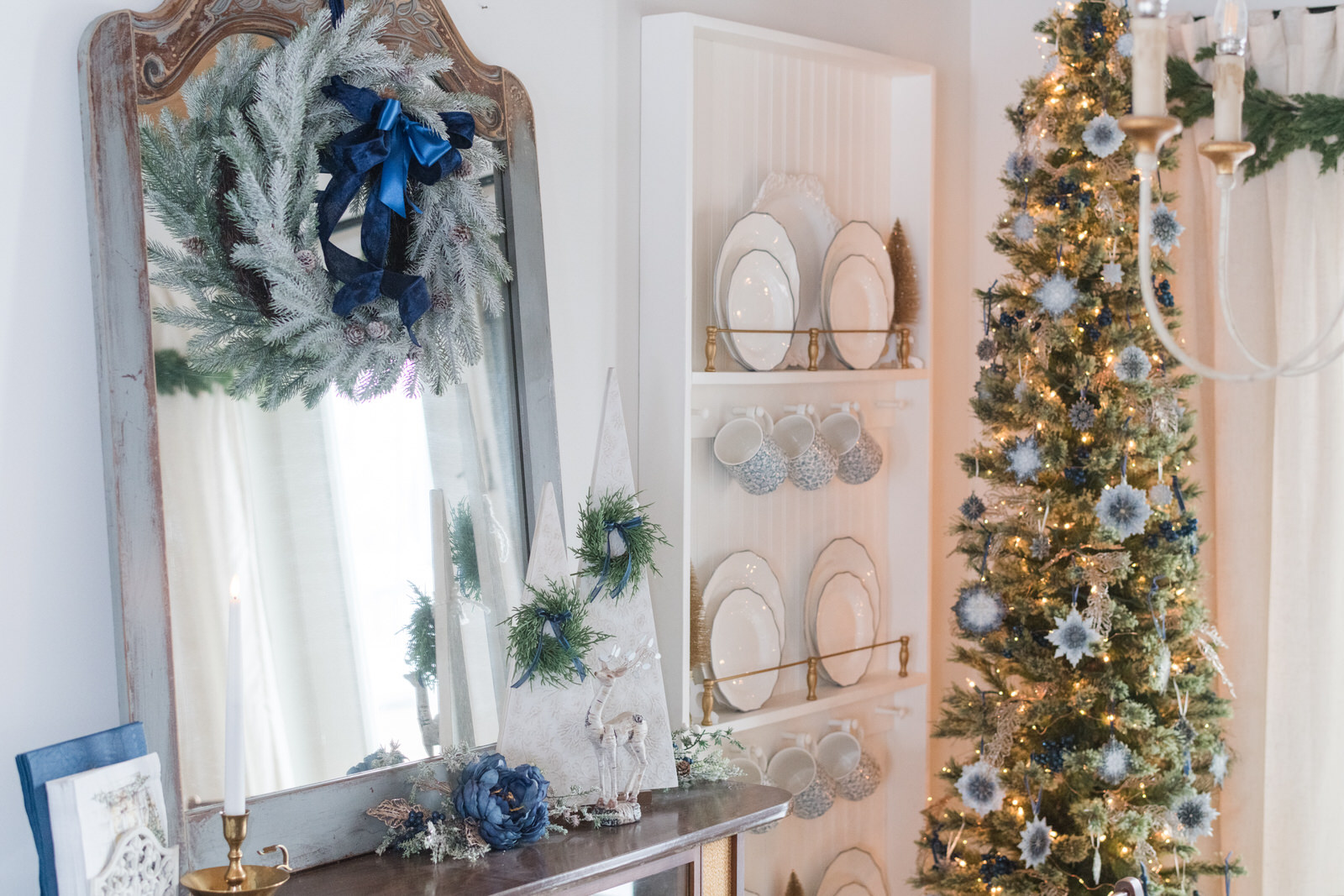 The tree is decorated, allowing the handmade details to shine. This year, I added DIY snowflake ornaments in blue, white, and gold that I created myself. They coordinate beautifully with the dishes, pottery, and the room’s overall colour palette. These ornaments add just enough sparkle while keeping the look soft and collected. See the blog post here where I share all my dining room Christmas DIYs.